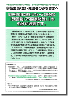 | 御施主(家主)・建設元請のみなさまへ 家屋等建築物の解体・リフォーム工事の前に「残留物(不要家財等)」の処分が必要です ![]() |